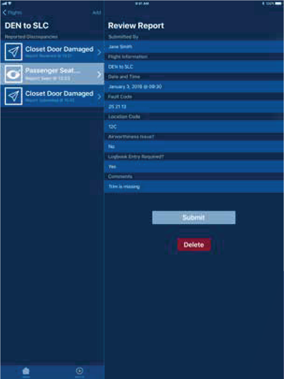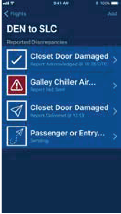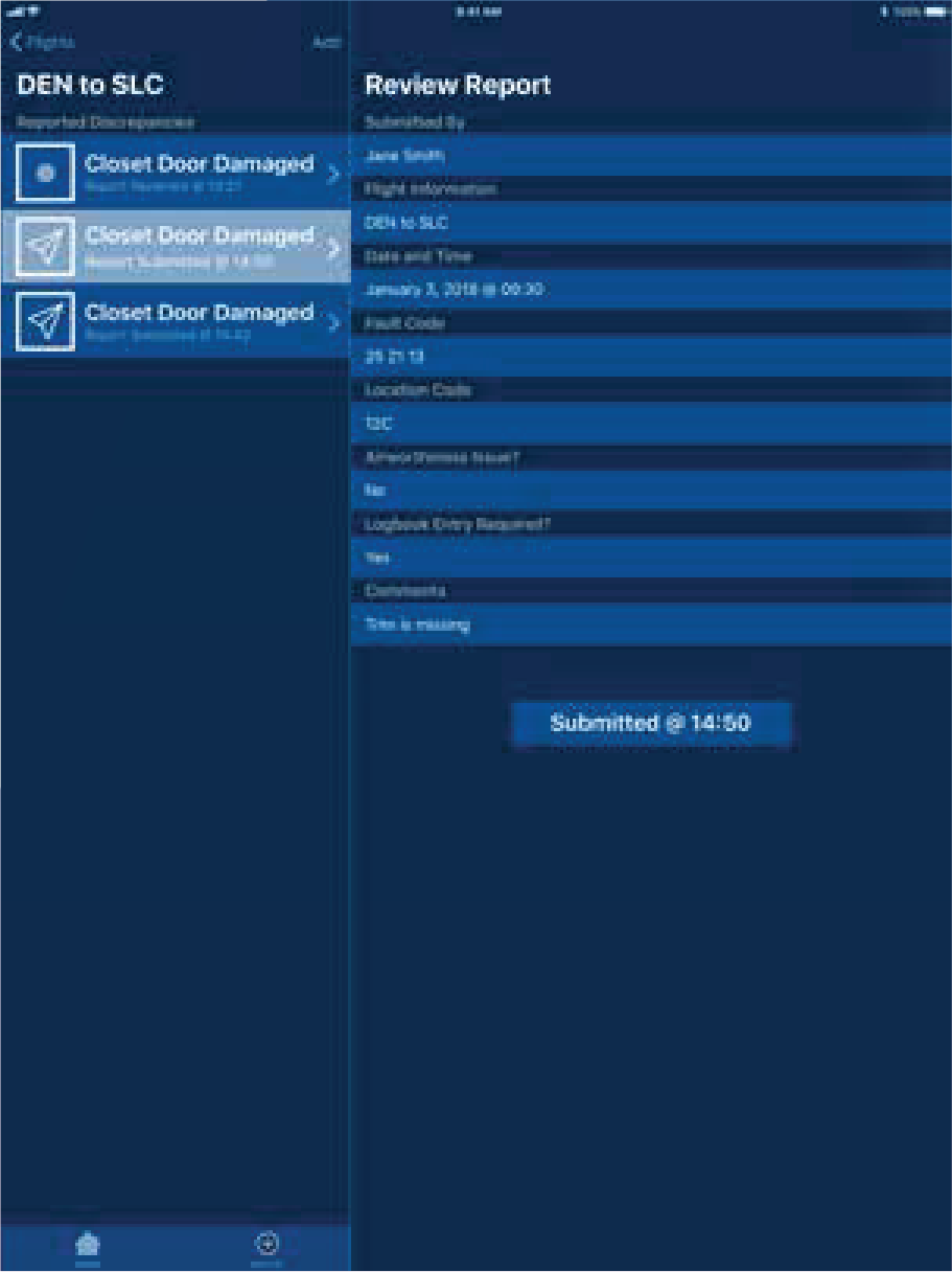 We designed the app in such a way, so that the device type is used to identify the type of user, rather than hard-coding it into the application itself — since only the pilots use iPads and only the flight attendants use iPhones. This side of the app allows the pilots to quickly review the cabin discrepancy reports and pass them along to Maintenance. Rather than the current way where they have to painstakingly type in the report by hand into the small on-board computer (ACARS).